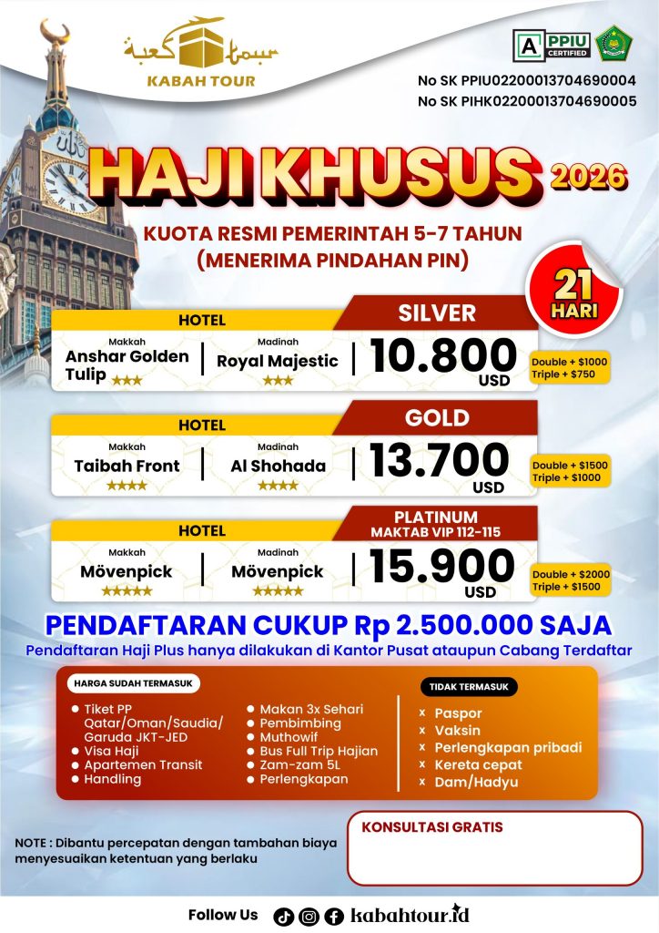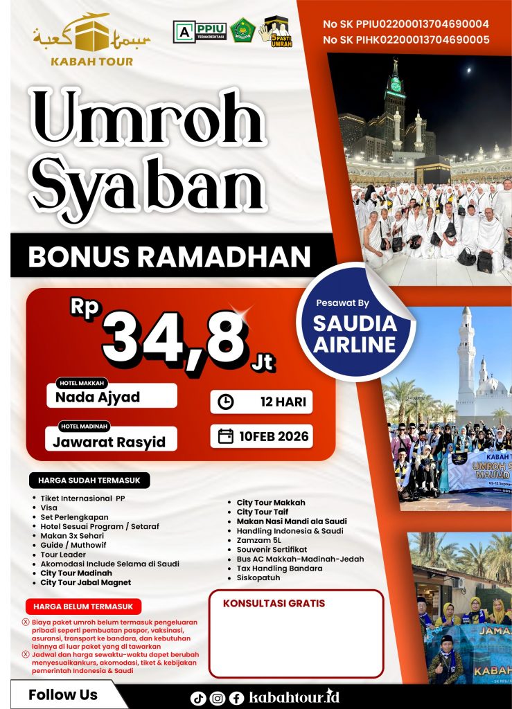 Nikmati perjalanan dengan fasilitas lengkap mulai dari akomodasi, bimbingan hingga perlengkapan umroh untuk memastikan pengalaman yang lebih nyaman.