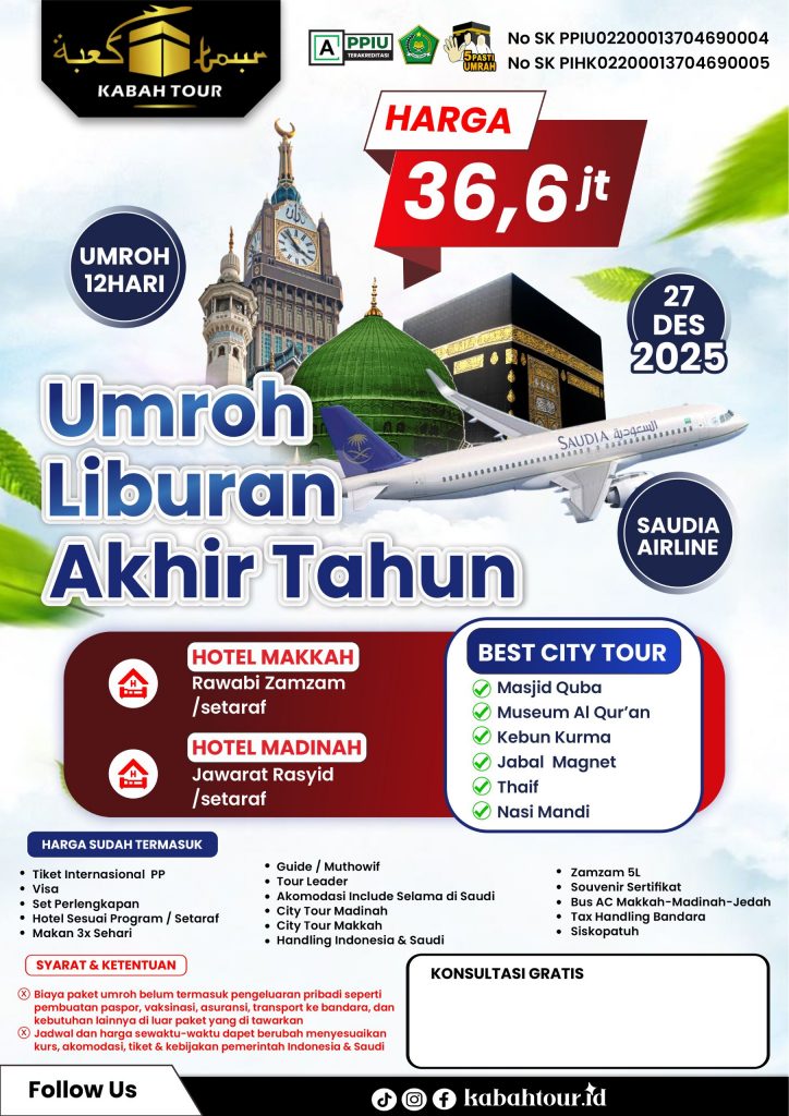 Kabah Tour selalu menyediakan berbagai paket komplit umroh untuk para jamaah Indonesia. Tim kami sudah sangat berpengalaman menangani umroh, sehingga anda tidak perlu khawaatir dengan layanan kami.